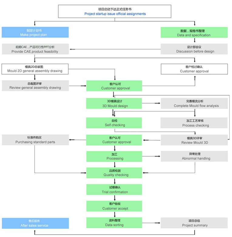 YWX项目团队拥有丰富的项目跟进与模具技术经验,与客户愉悦地技术沟通,与公司内部各部门顺畅地协调。这团队拥有严格的执行力,高度的责任感,是值得信赖的。每一个项目都必须至少依照如下跟进流程,并且执行到位,为客户满意是我们项目团队的使命。